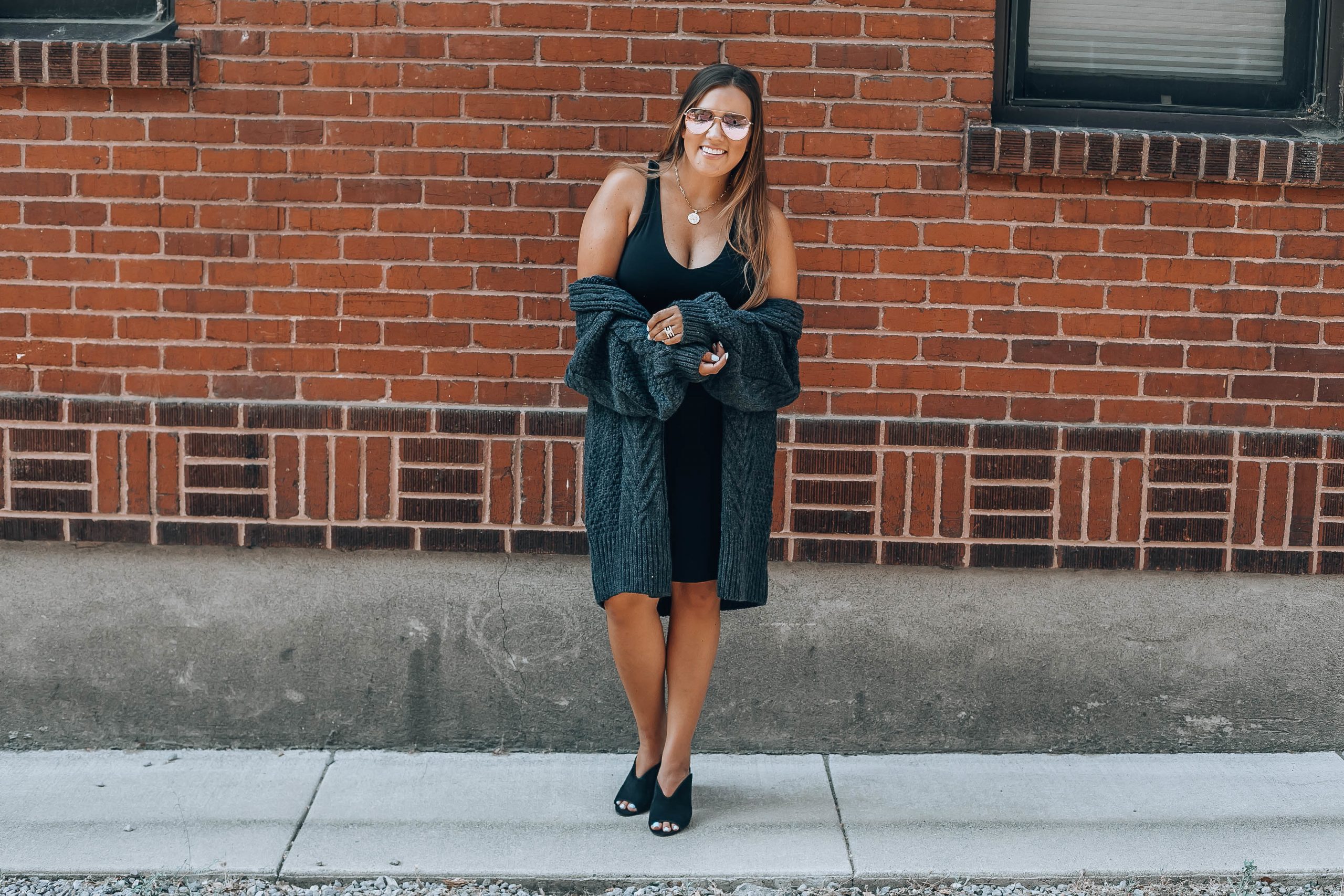 Ashley Zeal from Two Peas in a Prada wears a Free People chunky knit sweater on sale.