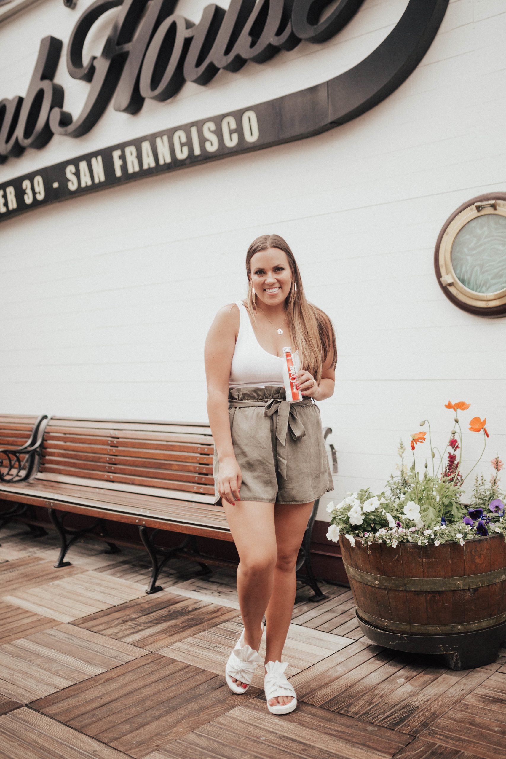 Ashley Zeal from Two Peas in a Prada partners with Express for their launch of extended sizes. She is wearing green high-waisted shorts and a white ribbed tank.