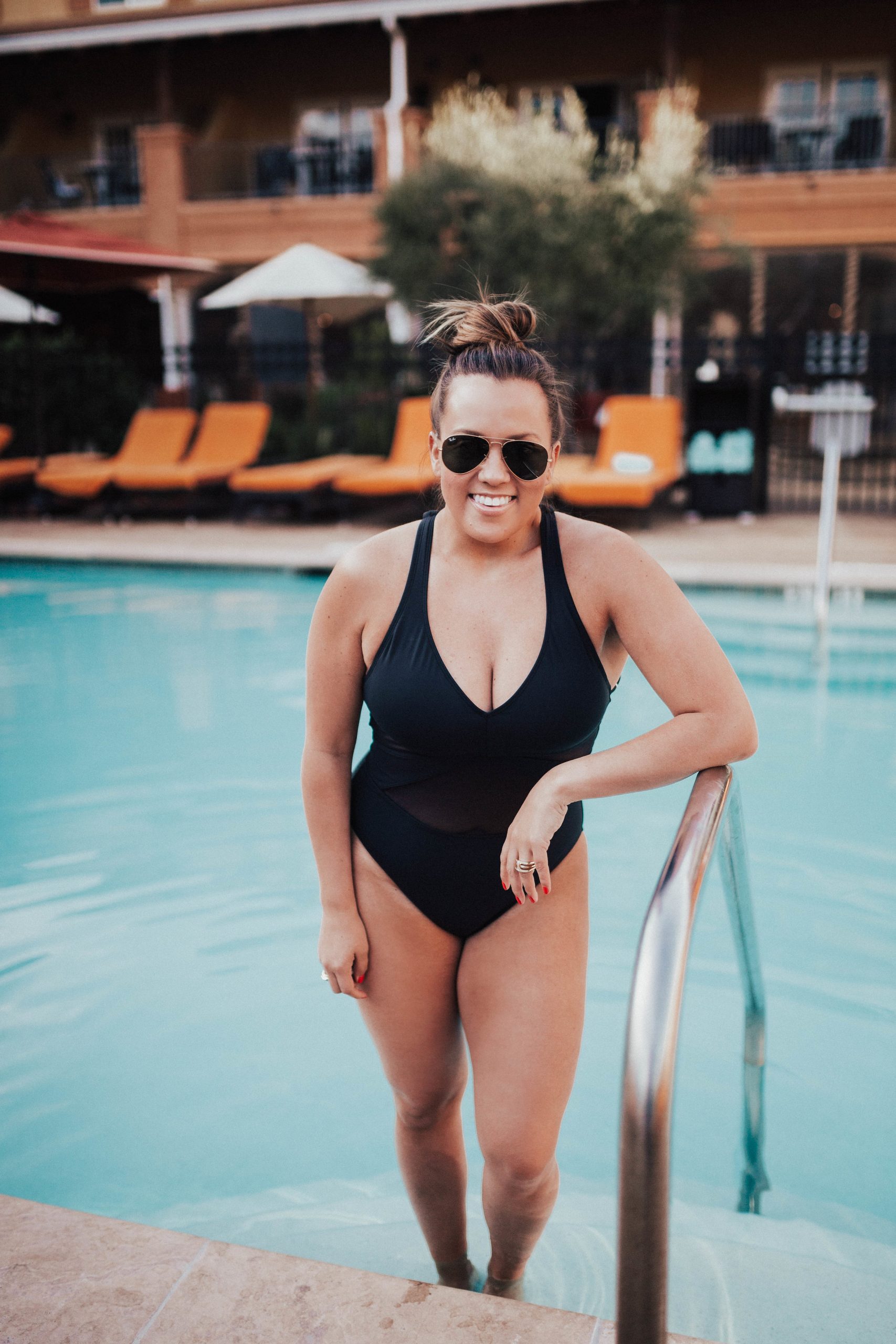 Ashley Zeal from Two Peas in a Prada shares what's in her beach bag, including: sunscreen, lip balm, sunnies and sun hats! She is wearing Bleu by Rod Beattie.