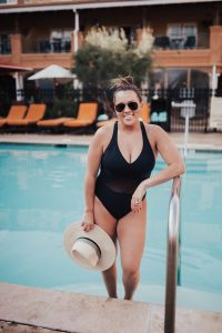 Ashley Zeal from Two Peas in a Prada shares what's in her beach bag, including: sunscreen, lip balm, sunnies and sun hats! She is wearing Bleu by Rod Beattie.